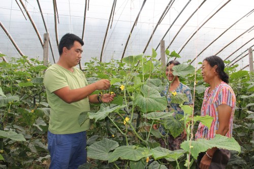 ● 苗育春 (左) 为菜农讲解大棚种植技术