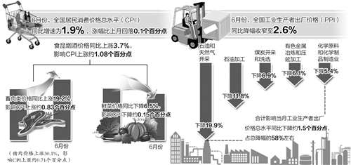 7月10日,国家统计局发布6月份全国居民消费价格指数(CPI)和工业生产者出厂价格指数(PPI)。数据显示,6月份,CPI环比下降0.1%,同比上涨1.9%;PPI环比下降0.2%,同比下降2.6%。